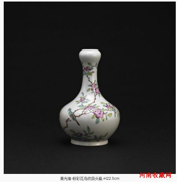 御窑瓷器方面,“清乾隆 釉里红文字梵语双耳扁瓶”极为珍贵,此件釉里红扁瓶慕仿永乐青花器,造型古朴秀美,而器形较永乐器更为小巧,更为难得的是故宫博物院所藏“顒琰古装行乐图”,画中嘉庆皇帝身边的案桌之上就陈设有一件此种釉里红扁瓶,造型纹饰均与本品相同,可见此件拍品级别之高。另有一件“清光绪粉彩花鸟纹蒜头瓶”颇为引人注意,此器画意清新,纹饰布局疏朗,故宫博物院藏有此类蒜头瓶的瓷器画样,器形纹饰毫无二致。