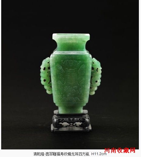 宫廷陈设品中,一件“清乾隆 翡翠雕福寿纹螭龙耳四方瓶”颇为亮眼,此件拍品为山中商会旧藏,并有1942年最后的购买发票及多次早期展览记录,来源清楚,传承有序。瓶呈四方形,撇口束颈,腹部两面减地浮雕蝙蝠寿字纹,寓意“福寿双全”,另两面对称置螭龙耳。此瓶取材自天然翡翠,翠色灵透,造型小巧,运用阴刻、浮雕、镂雕等多种雕刻技法,所雕纹饰清晰,线条有力。